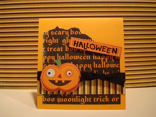 I had everything ready and cut out for this card, but I had to make some last minute changes because it didn’t come out the way I pictured it in my mind. I originally wanted to use a dark purple card stock with the same patterned papers and wanted to use ghosts instead of jack-o-lanterns, but you can see that’s not the case =)