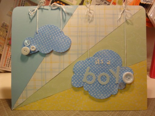 Here is another 8.5×11″ card my cousin requested. I continued to use an older Creative Memories patterned paper pack. I also sketched out two clouds and stamped some polka dots on them. I then embossed it with some clear embossing powder. Originally I was going to keep the clouds white, but when I was experimenting with a blue ink pad I accidentally dropped it face down onto one of my clouds…so I decided to ink the entire thing. Since it was embossed, the dots remained un-inked. It turned out to be a pretty cool effect for the clouds. I added a few buttons here and there for some detailing as well as some embroidery floss to “hang” the clouds.