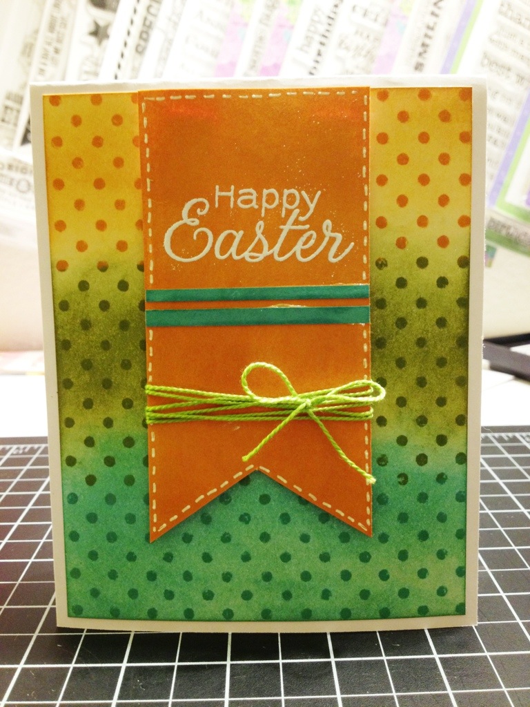Here’s an Easter card for this week. Using Hero Arts’ Polka Dot Background stamp and some Tim Holtz Distress Ink in Wild Honey, Peeled Paint, and Evergreen Bough, I decided to go with a gradient look. After stamping it initially on white card stock, it seemed a little plain. So I took out some Ink Blending Foam and started blending the coordinating ink.