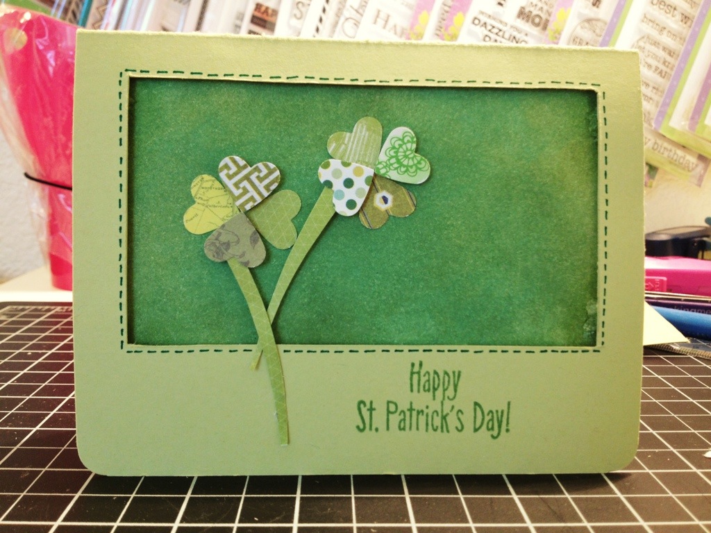 The cardstock is from Papertrey Ink. I used some Distress Ink in Peeled Paint and Evergreen Bough to blend the background. I used patterned paper from different 6×6 pads and a heart punch to put together a “four leaf clover”. I love the idea of having the clovers within the frame but the stems hanging off the frame.