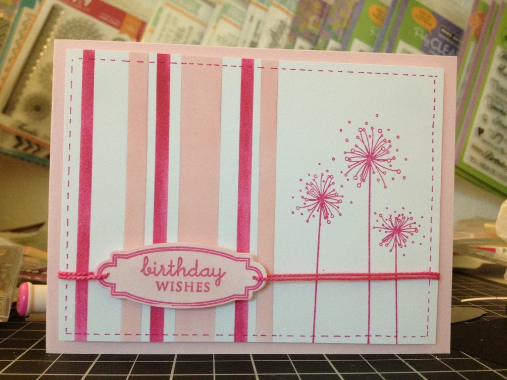 Here I used the same technique as my last card. I used the ink foam blender to create the stripes with Stampin Up! inks in Pink Pirouette and Melon Mambo along with Colorbox Fluid Chalk Ink in Berrylicious. The whimsical flowers are from Technique Tuesday’s Wishes stamp set. I made the tag using Simon Says Stamp’s Holiday Labels. I cut the tag on a white piece of cardstock and decided to ink it with Pink Pirouette to bring in the stripes.