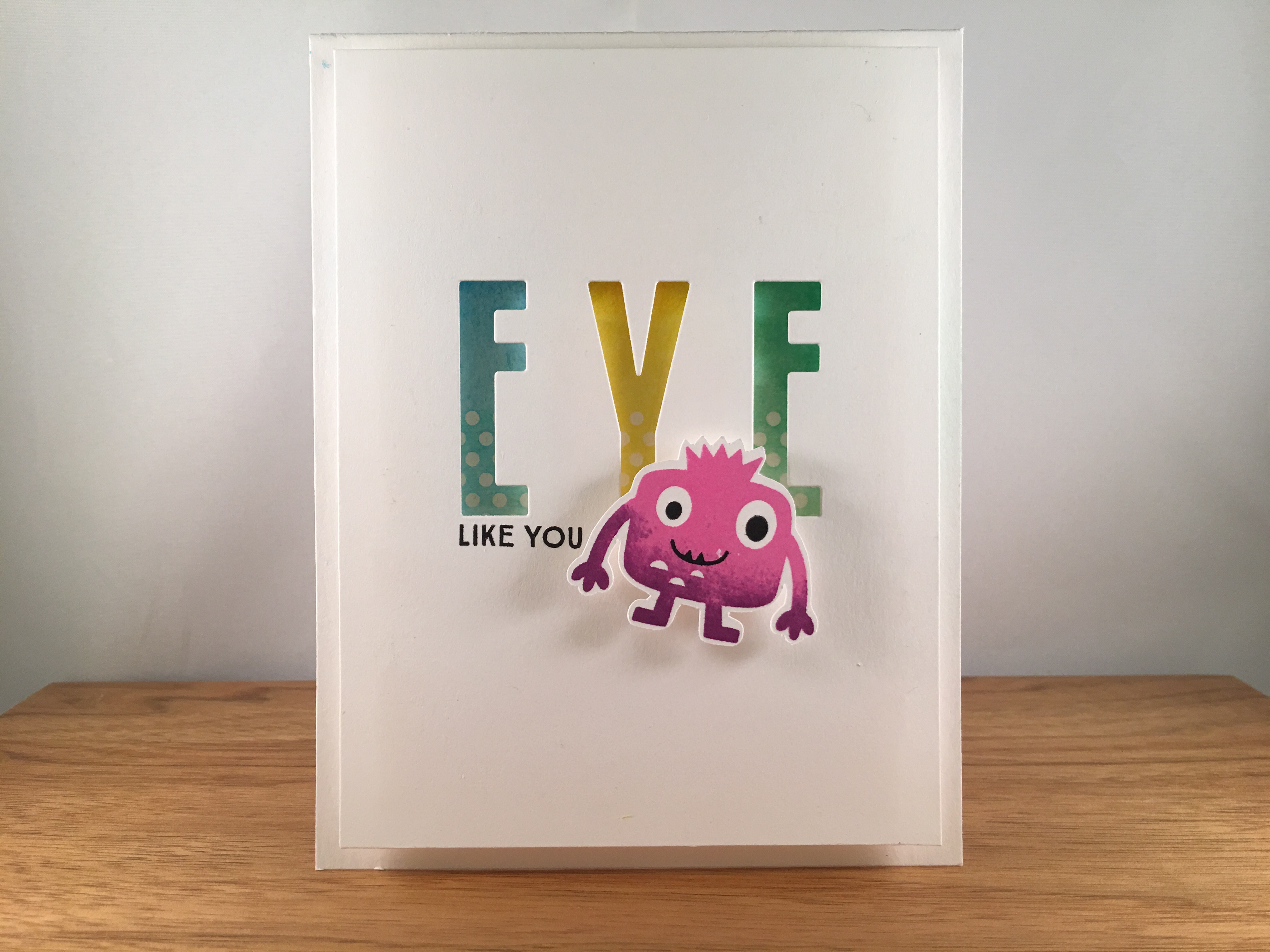 This time I used the High Rise Lower Case Alpha Die-Namics. Again, still using the Monster Love Stamp Set. I added some fun googly eyes as an accent to the Monsters (not sure if that disqualifies the card though).