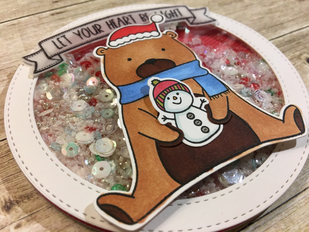 I stamped the banner using wPlus 9’s Be Merry Die (goes with the Be Merry Stamp Set). The sentiment is from Neat & Tangle’s Scandinavian Prints Stamp Set. The bear and snowman are from Neat & Tangle’s Beary Merry Stamp Set and Coordinating dies. I love how the die set cuts out the arms so it can hold things! Super cute! The Santa Hat is actually from Simon Say’s Stamp’s Stamptember collaboration stamp set with Pretty Pink Posh called Winter Bird Friend. I thought it would be cute to put it in the bear 🙂