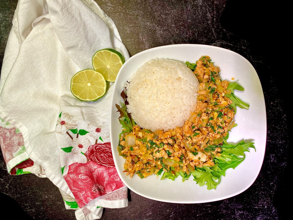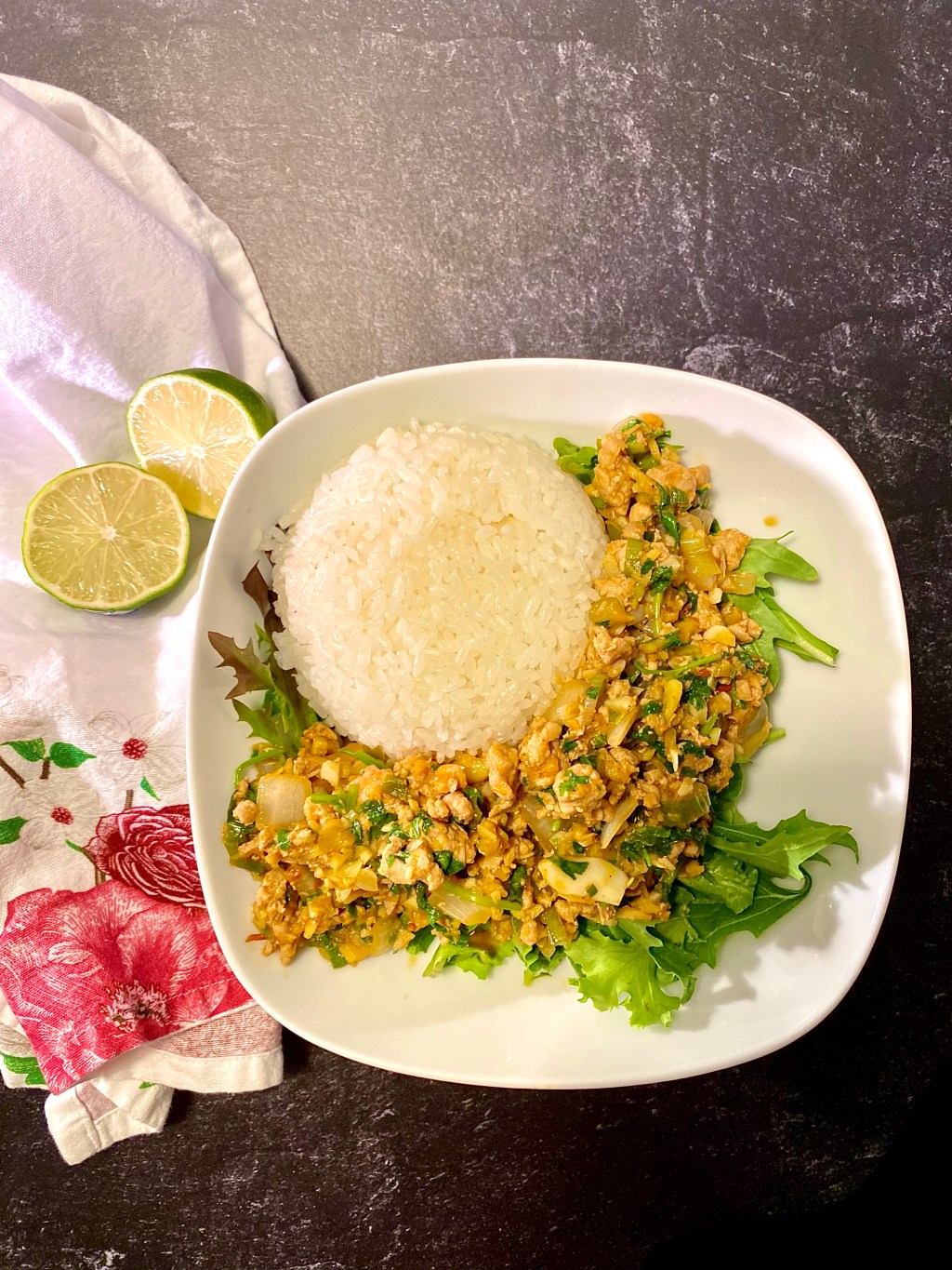 I like to serve it with white rice over a bed of salad. Usually it’s spring mix or whatever greens I have in the fridge that week.