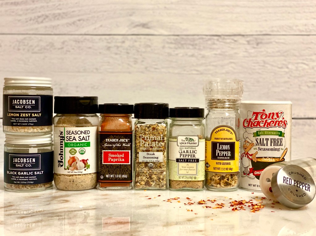 For seafood: Jacobsen Salt Co Lemon Zest Salt, Trader Joe’s Smoked Paprika, Spice Hunter’s Garlic Pepper, Trader Joe’s Lemon Pepper, Tony Chachere’s Salt Free Seasoning, Kirkland Granulated California Garlic
