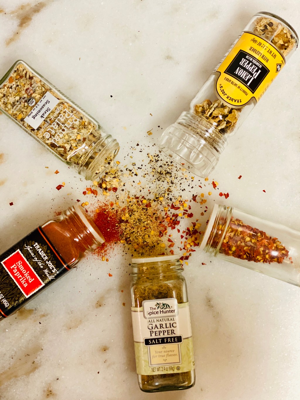 Clockwise from the top left: Primal Palate Steak Seasoning, Trader Joe’s Lemon Pepper Grinder, Kirkland Red Pepper Flakes, The Spice Hunter Garlic Pepper, Trader Joe’s Smoked Paprika.