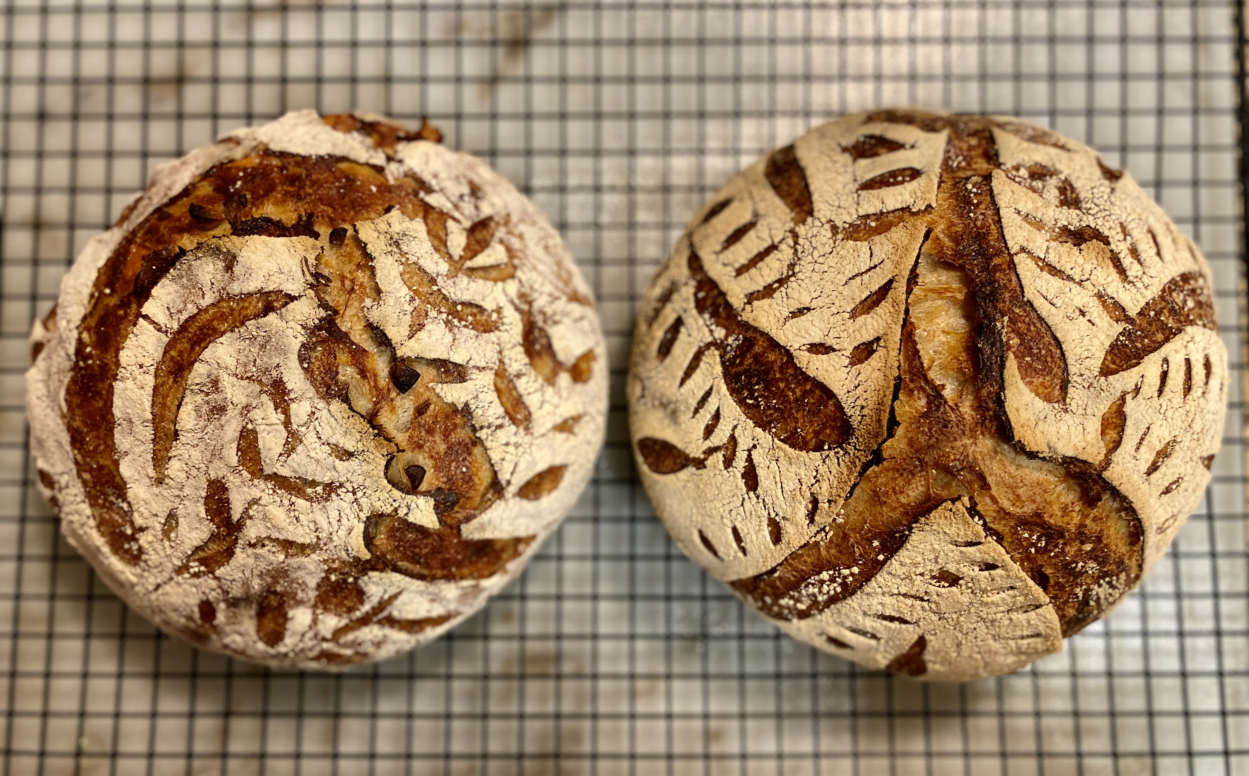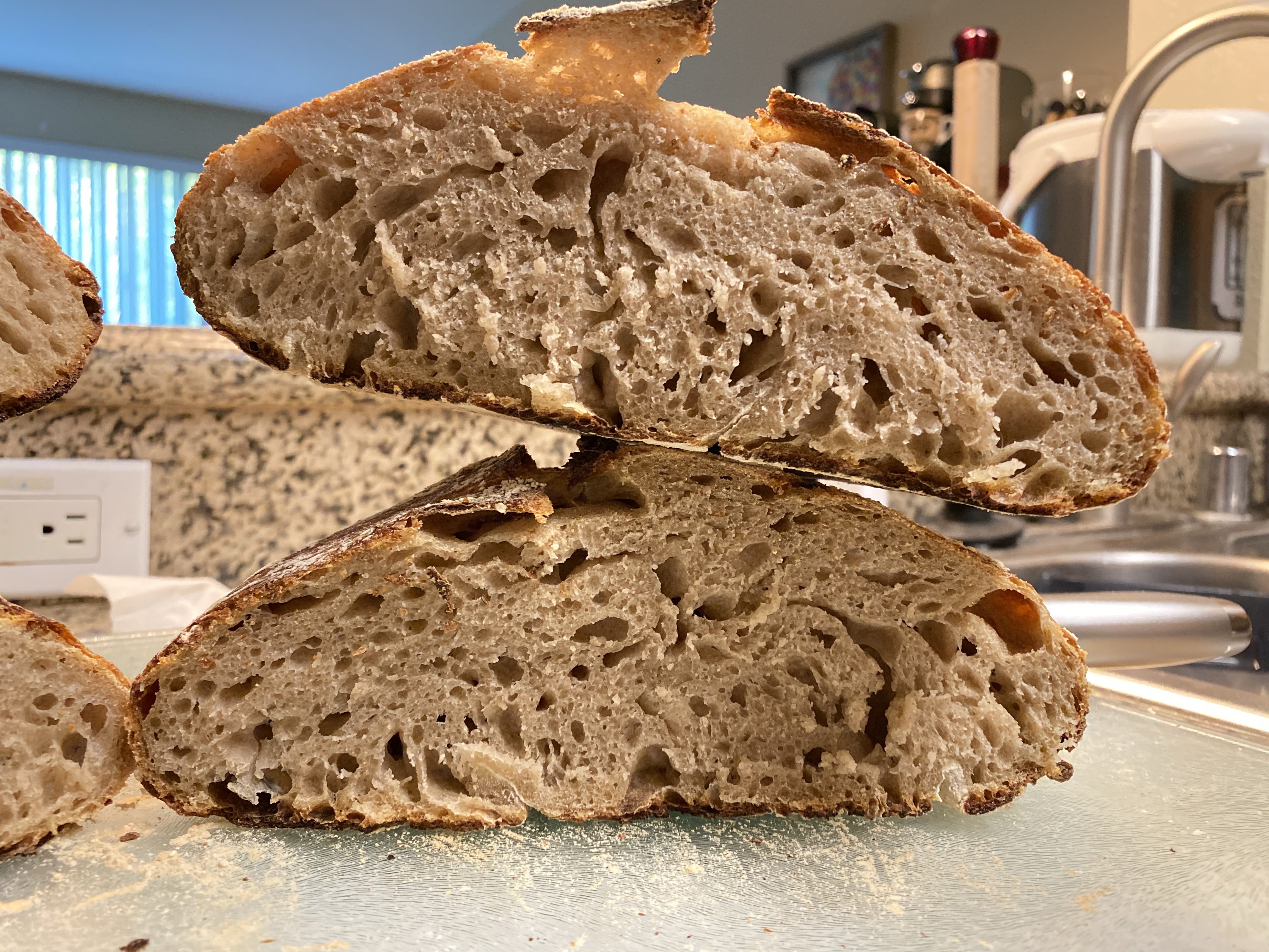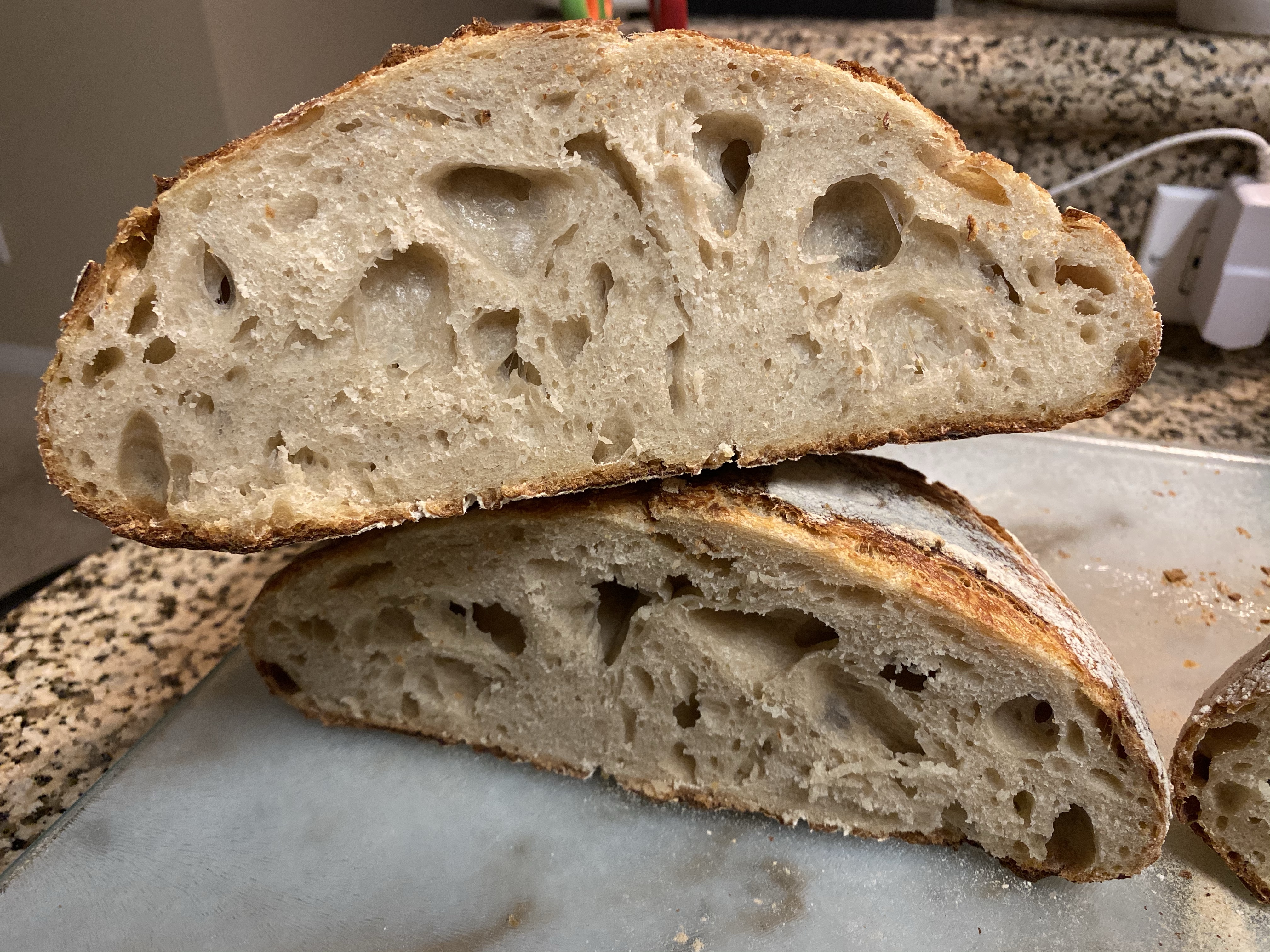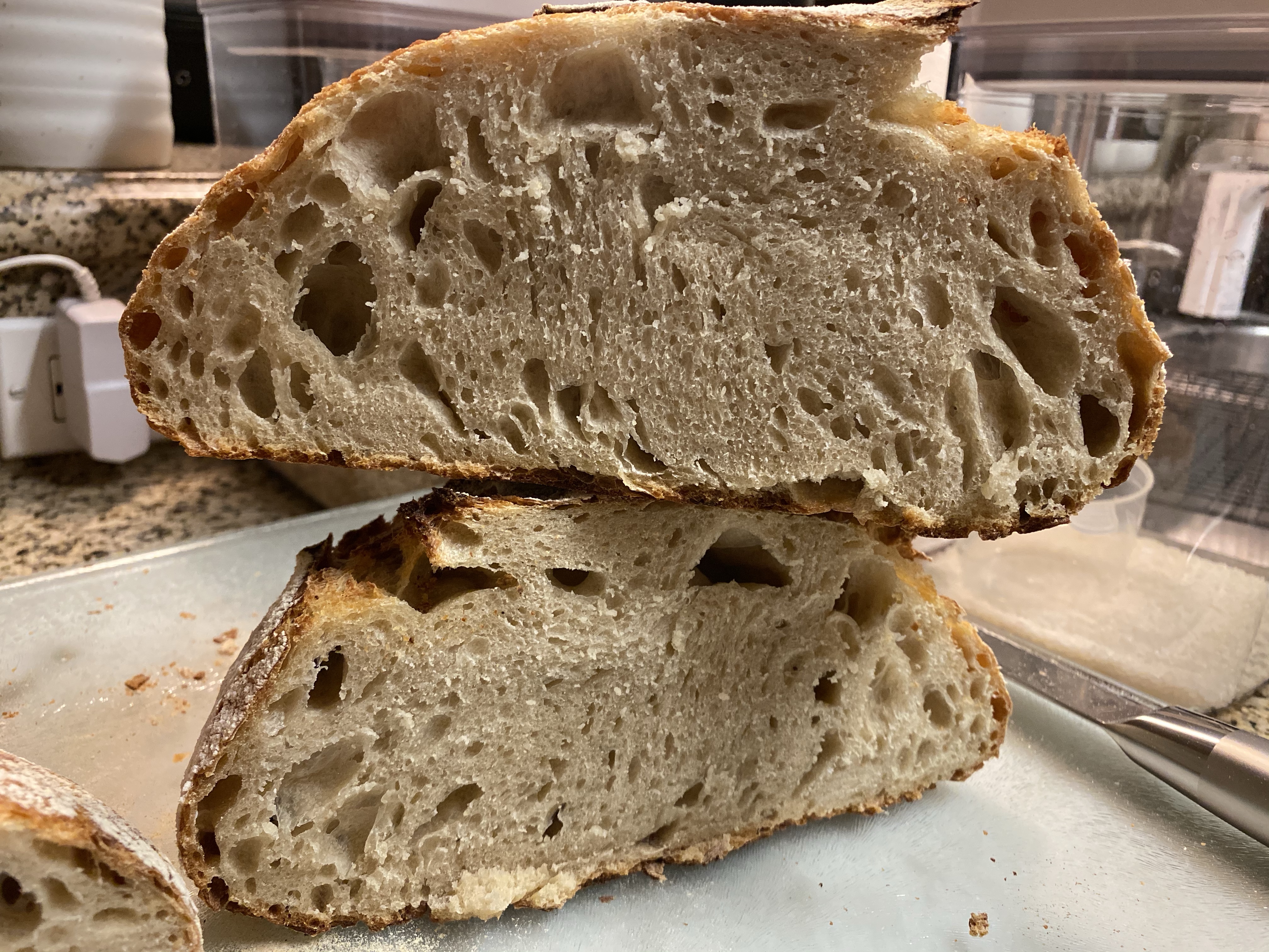 The longer you leave it out and feed prior to starting the recipe, the more time the yeast has to develop. So for the third bake, I took the starter out during my weekly feed and left it out to feed for exactly one week, feeding it twice a day. This achieved that signature sour in sourdough. For this third bake, I tried the Intermediate Sourdough recipe in Bonnie’s book. The difference was incorporating whole wheat flour now into your overnight starter (starts the bread recipe) along with several folds during the first 2.5 hours of the rise. More details listed in the book, of course.