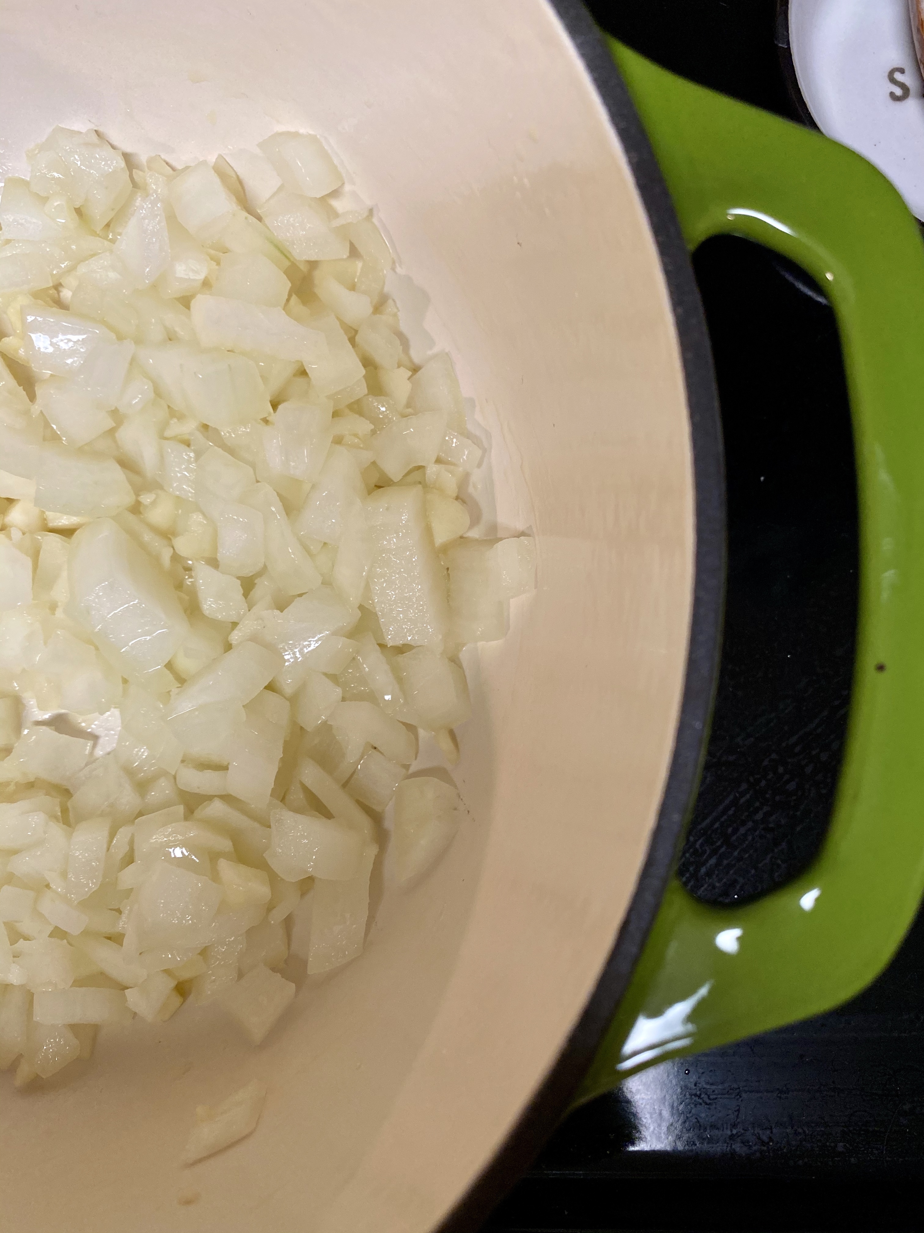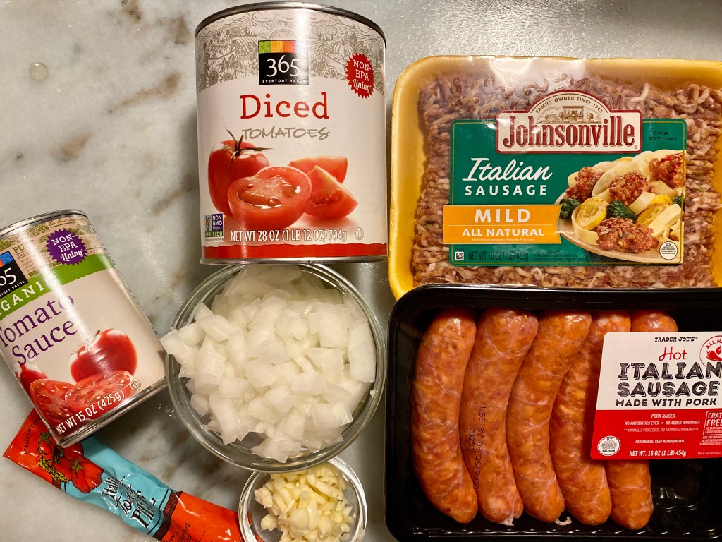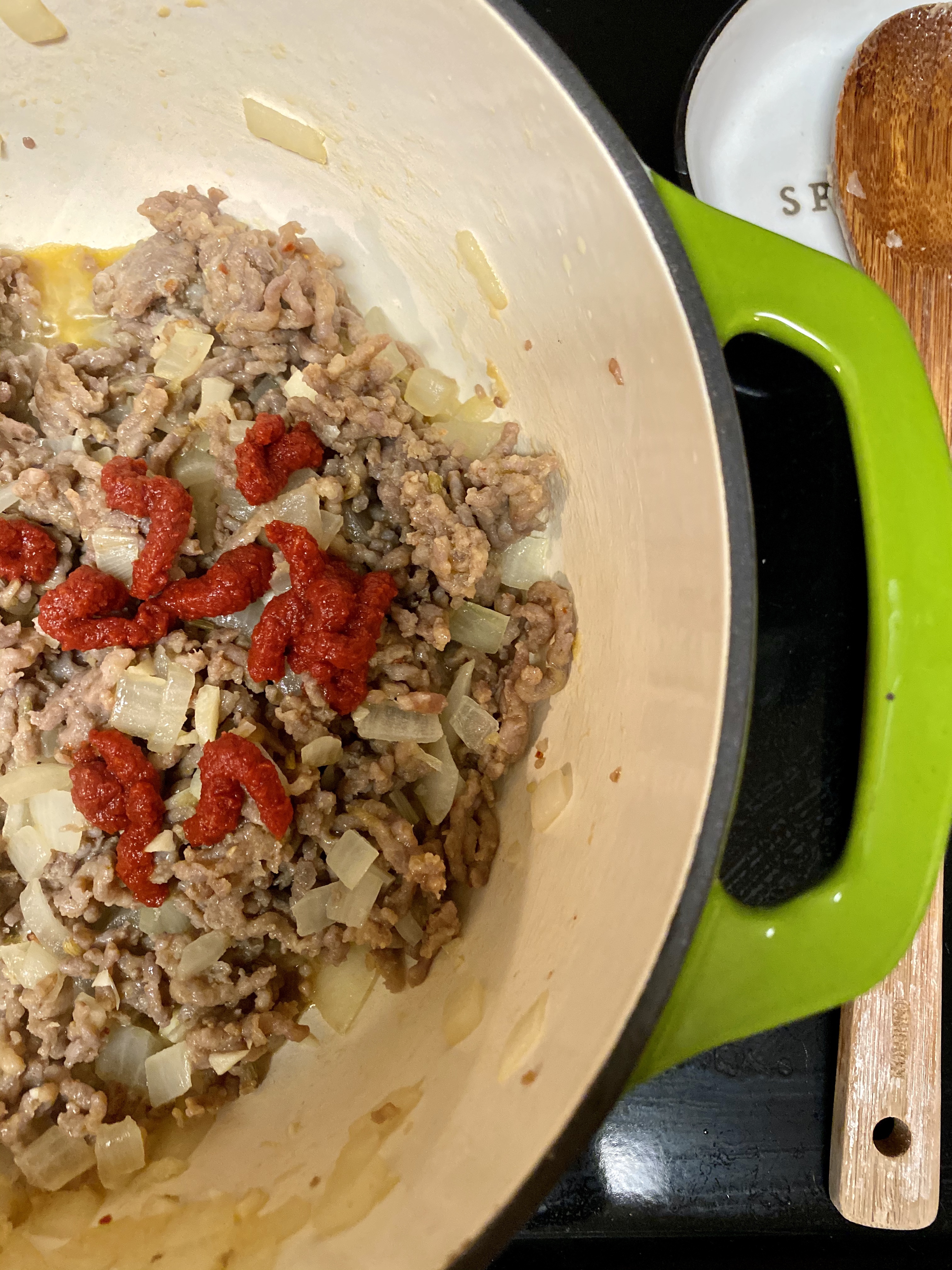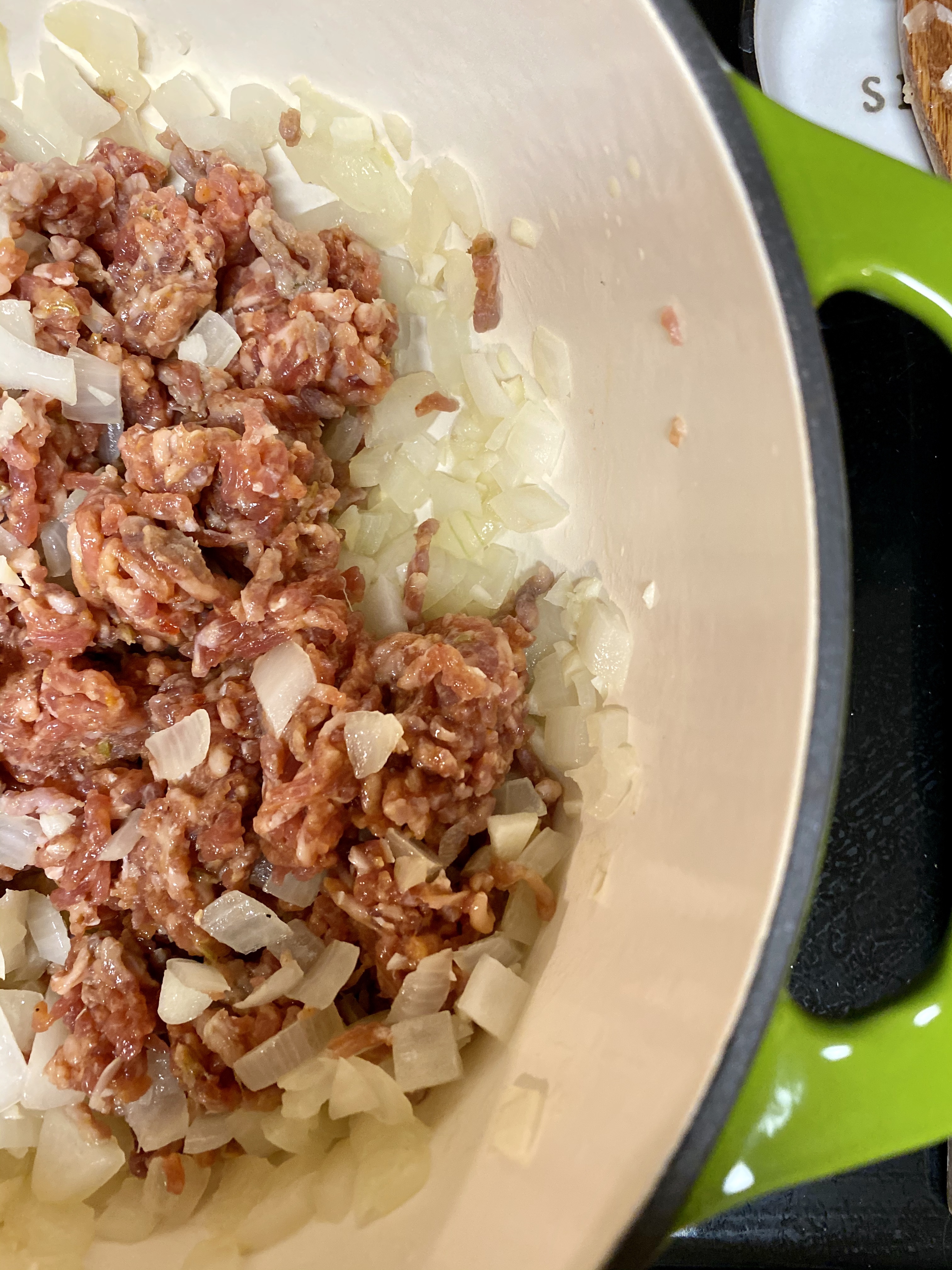 Sauté the onion and minced garlic in a Dutch oven. Add the ground Italian sausage when the onion becomes fragrant, about 2-3 minutes. Meanwhile, pan-sear the Italian sausage links separately. PS: the Hot Italian Sausage from Trader Joe’s is seriously the best! But, know that it is hot!