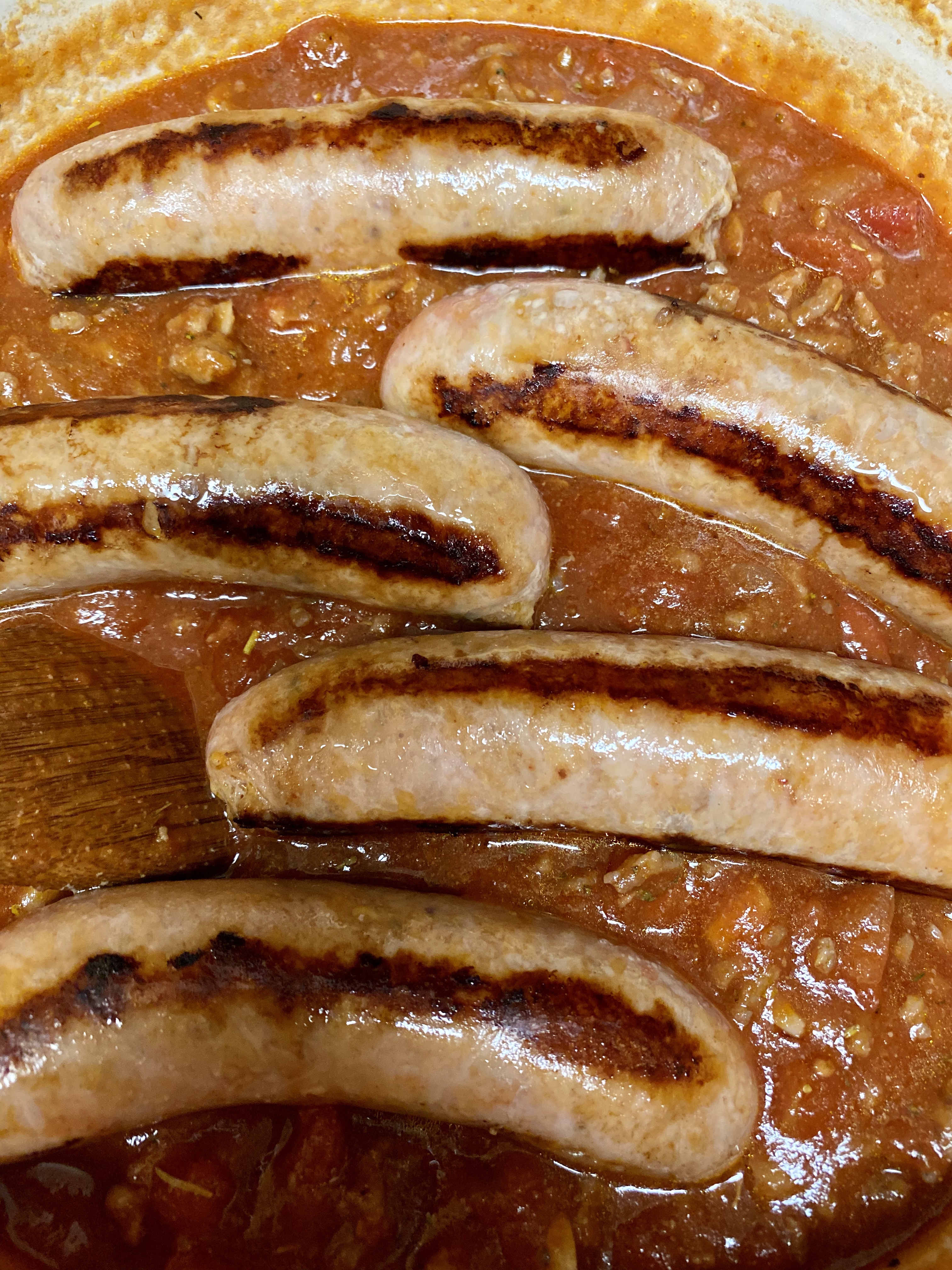 Once the ground sausage is just about cooked, add the tomato paste. Mix it around and let the fragrances release for about 1 minute. From there, add the tomato sauce, diced tomatoes and seasonings to the Dutch oven. Mix it up. Before you close the lid, add your seared Italian sausage links. Close the lid and simmer for at least 1 hour.