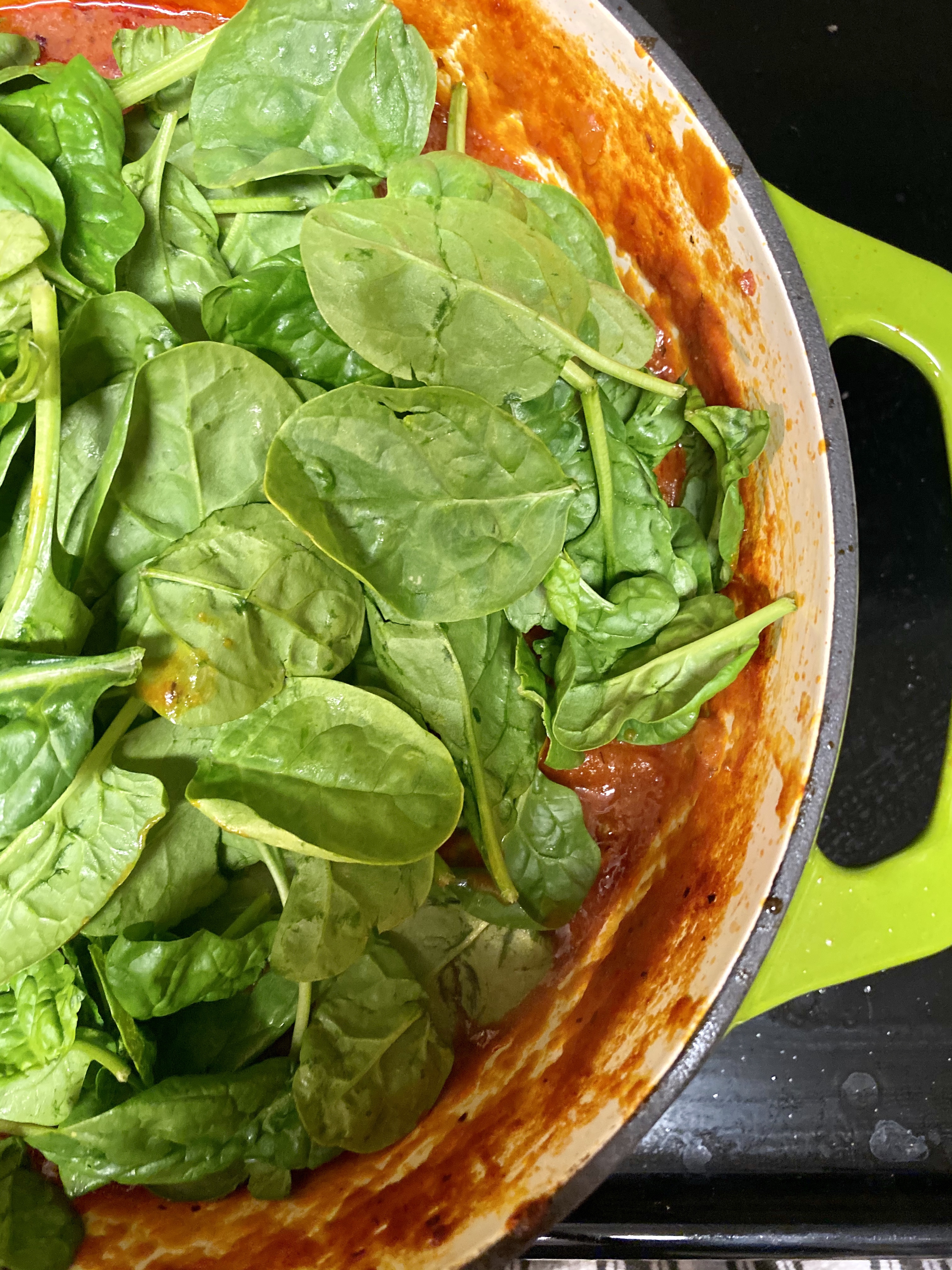 After about an hour, you’re ready to cook the paste of your choice. I used Barilla Gluten Free Spaghetti. When that’s cooked al dente then add the spinach to the sauce. Stir it up and serve it over your pasta!